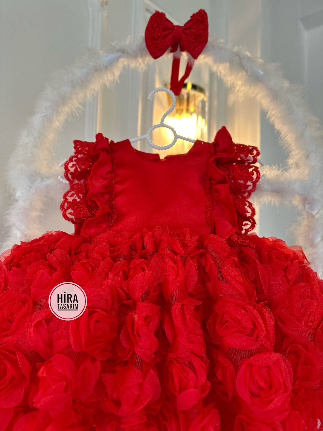 Fırfır Dantel Kırmızı Güllü Bebek Abiyesi, özel günlerde minik prenseslerin zarafetini ortaya çıkaracak şık bir tasarıma sahiptir. Yumuşak tül kumaşı ve inci detaylı eteğiyle bebeğiniz rahat ederken aynı zamanda göz alıcı bir şıklık kazanır. Kırmızı rengi güllerle süslenmiş zarif tasarımı, doğum günü, düğün, nişan, bayram ve özel davetlerde bebeğinize masalsı bir görünüm kazandırır.