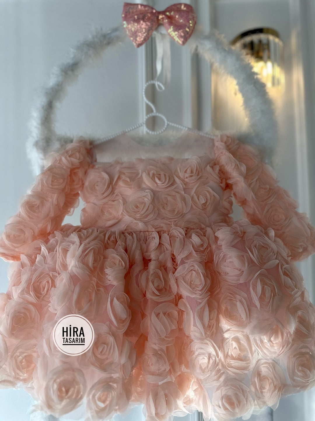 Prenses Kol Somon Güllü Bebek Abiyesi, özel günlerde minik prenseslerin zarafetini ortaya çıkaracak şık bir tasarıma sahiptir. Yumuşak tül kumaşı ve inci detaylı eteğiyle bebeğiniz rahat ederken aynı zamanda göz alıcı bir şıklık kazanır. Somon rengi güllerle süslenmiş zarif tasarımı, doğum günü, düğün, nişan, bayram ve özel davetlerde bebeğinize masalsı bir görünüm kazandırır.