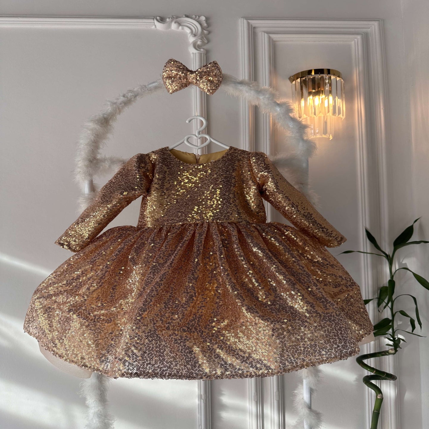 Altın rengi payetlerin ışıltısıyla göz kamaştıran Hira Gold Payetli kız çocuk abiyesi, bebeğinizin özel günlerini daha da özel hale getirecek.