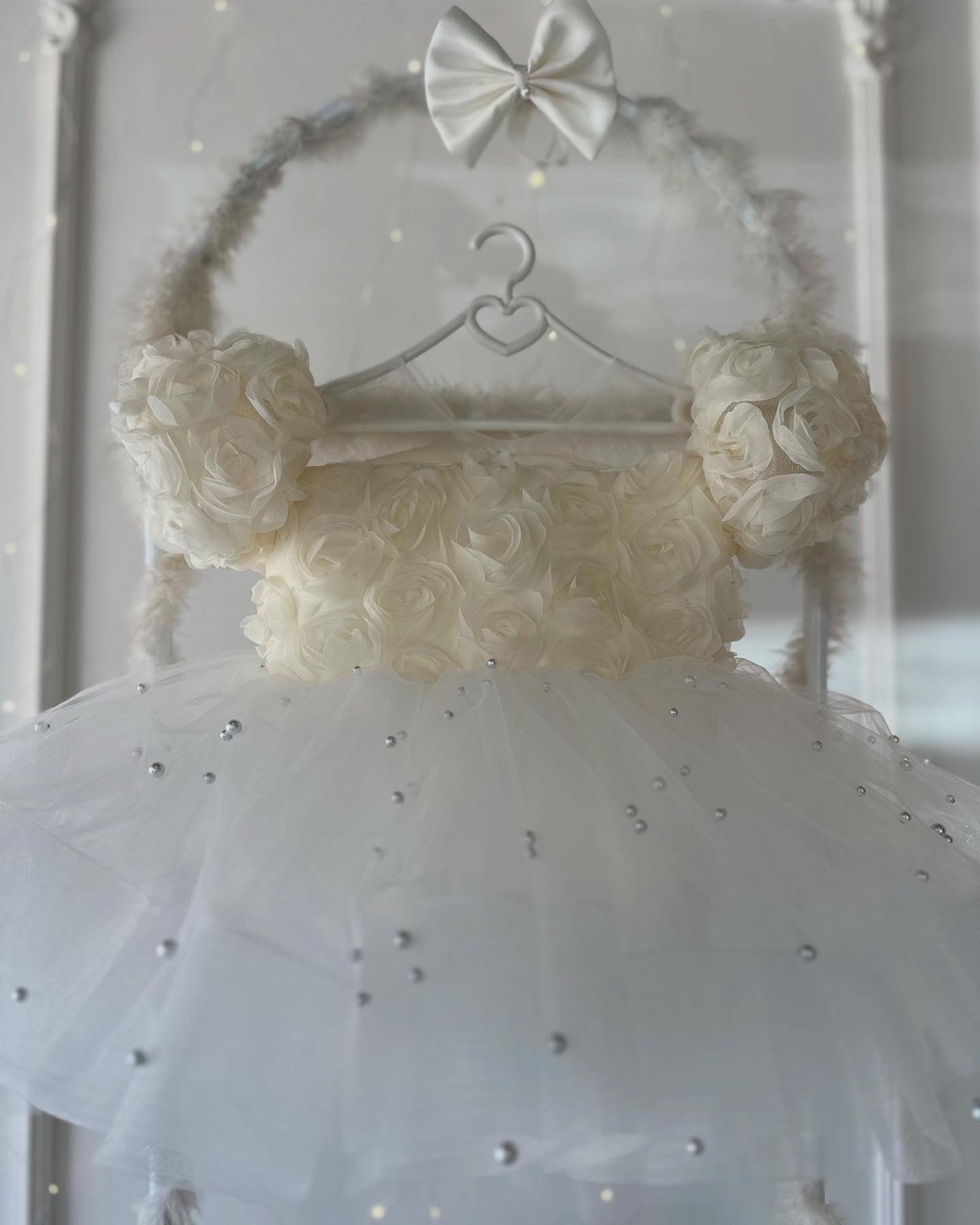 Bu özel tasarım abiye, her detayıyla titizlikle hazırlandı. Elbisenin üst kısmı, ışıl ışıl parlayan incilerle ve zarif boncuk işlemeleriyle süslenmiştir. Bu detaylar, abiyeye sofistike bir hava katarken, bebeğinizin masumiyetini ve güzelliğini ön plana çıkarır. Etek kısmında yer alan kabarık tüller ve el yapımı gül aplikleri, abiyeye masalsı bir dokunuş katarak bebeğinizin adeta bir peri kızı gibi görünmesini sağlar.