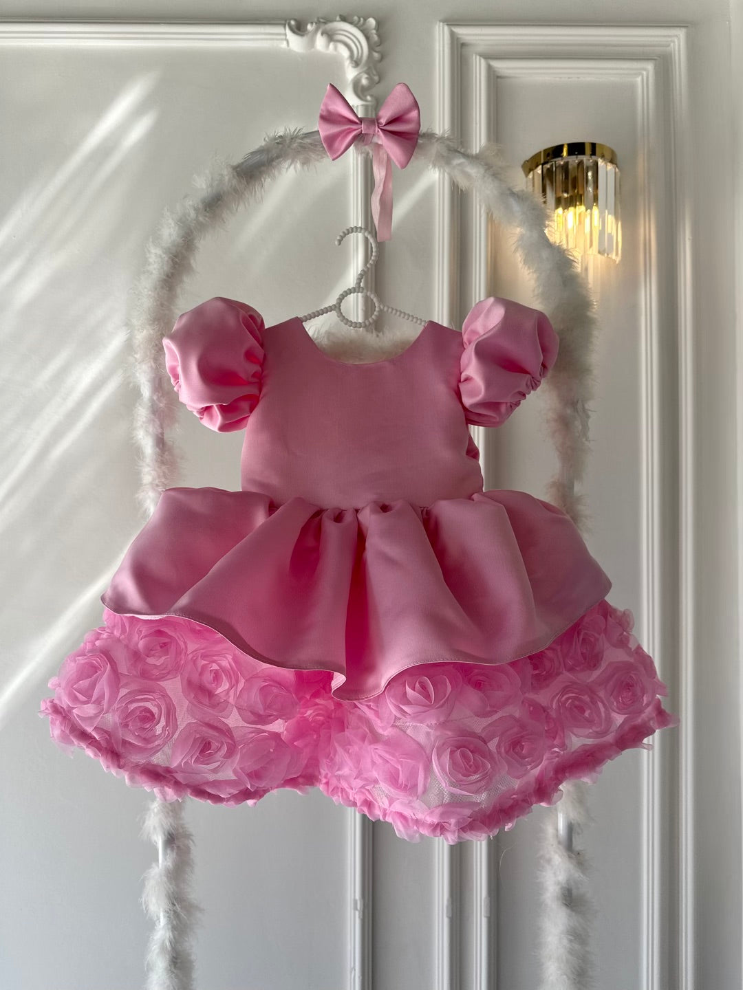 Kumaş Beden Pembe Güllü Bebek Abiyesi, özel günlerde minik prenseslerin zarafetini ortaya çıkaracak şık bir tasarıma sahiptir. Yumuşak tül kumaşı detaylı eteğiyle bebeğiniz rahat ederken aynı zamanda göz alıcı bir şıklık kazanır. Pembe rengi güllerle süslenmiş zarif tasarımı, doğum günü, düğün, nişan, bayram ve özel davetlerde bebeğinize masalsı bir görünüm kazandırır.