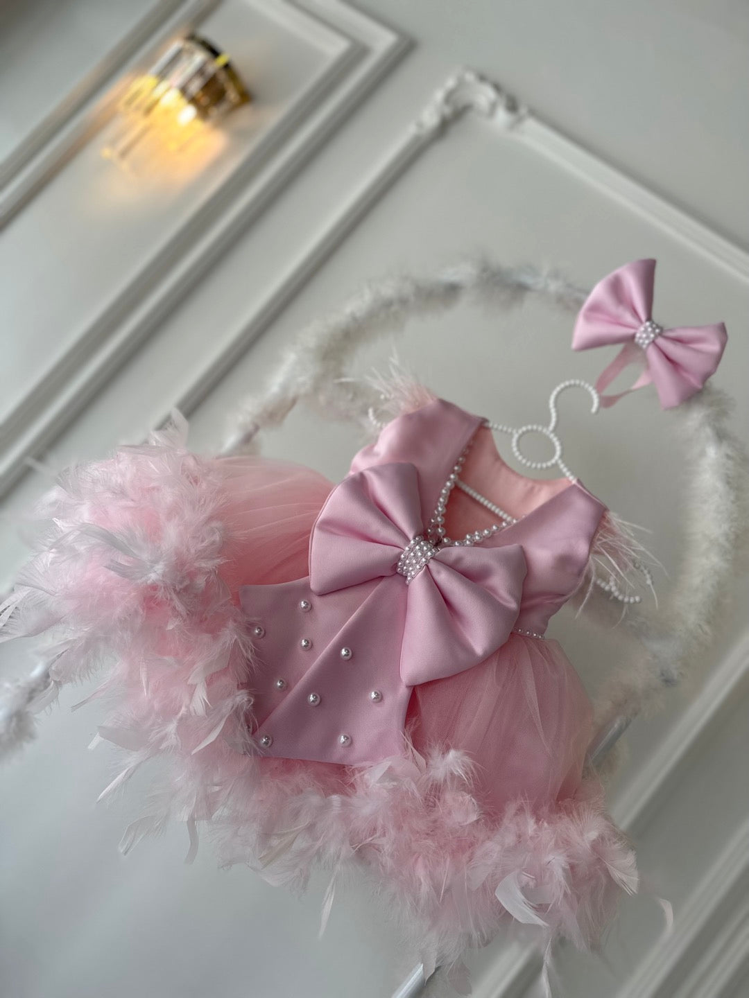 Prenses Sıfır Kol Arka V İnci Detay Etek Tüy Bebek Abiyesi, özel günlerde minik prenseslerin zarafetini ortaya çıkaracak şık bir tasarıma sahiptir. Yumuşak tül kumaşı detaylı eteğiyle bebeğiniz rahat ederken aynı zamanda göz alıcı bir şıklık kazanır. Pudra rengi süslenmiş zarif tasarımı, doğum günü, düğün, nişan, bayram ve özel davetlerde bebeğinize masalsı bir görünüm kazandırır.