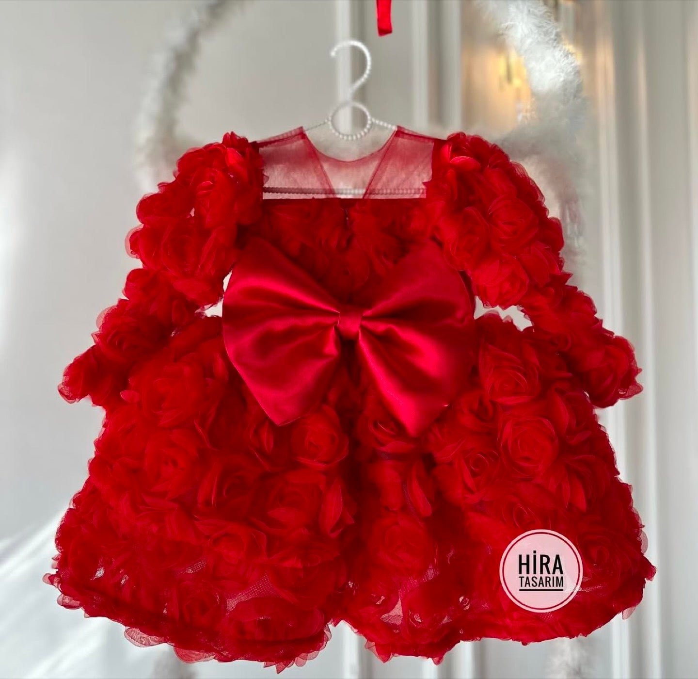 Prenses Kol Tül Yaka Kırmızı Güllü Bebek Abiyesi, özel günlerde minik prenseslerin zarafetini ortaya çıkaracak şık bir tasarıma sahiptir. Yumuşak tül kumaşı ve inci detaylı eteğiyle bebeğiniz rahat ederken aynı zamanda göz alıcı bir şıklık kazanır. Kırmızı rengi güllerle süslenmiş zarif tasarımı, doğum günü, düğün, nişan, bayram ve özel davetlerde bebeğinize masalsı bir görünüm kazandırır.