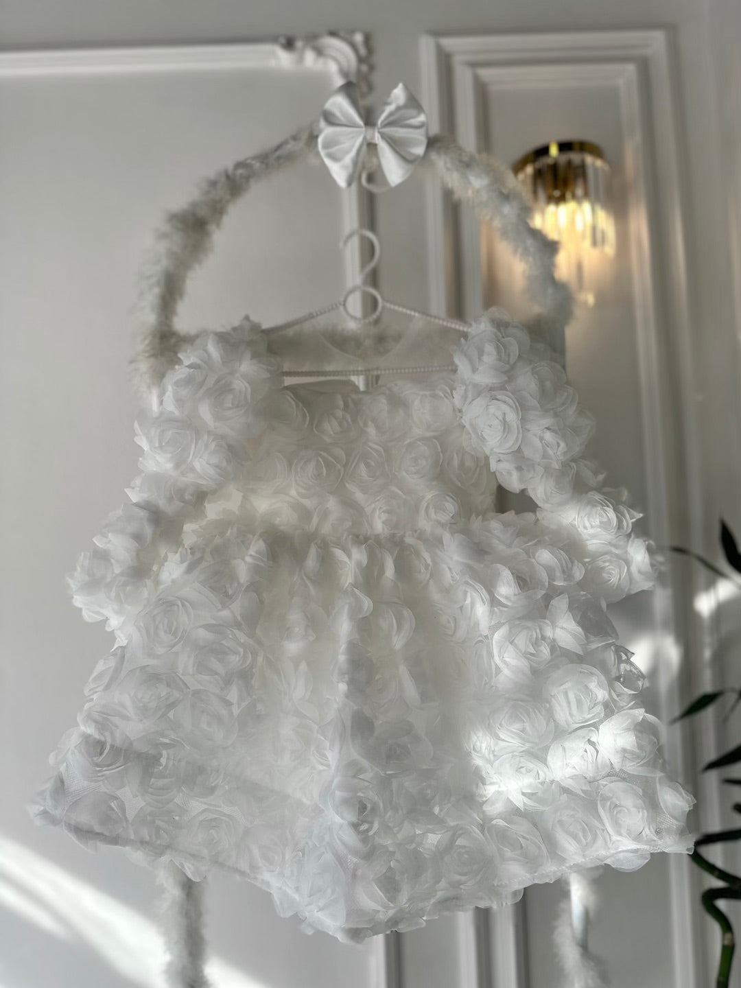 Prenses Kol Tül Yaka Beyaz Güllü Bebek Abiyesi, özel günlerde minik prenseslerin zarafetini ortaya çıkaracak şık bir tasarıma sahiptir. Yumuşak tül kumaşı detaylı eteğiyle bebeğiniz rahat ederken aynı zamanda göz alıcı bir şıklık kazanır. Beyaz rengi güllerle süslenmiş zarif tasarımı, doğum günü, düğün, nişan, bayram ve özel davetlerde bebeğinize masalsı bir görünüm kazandırır.