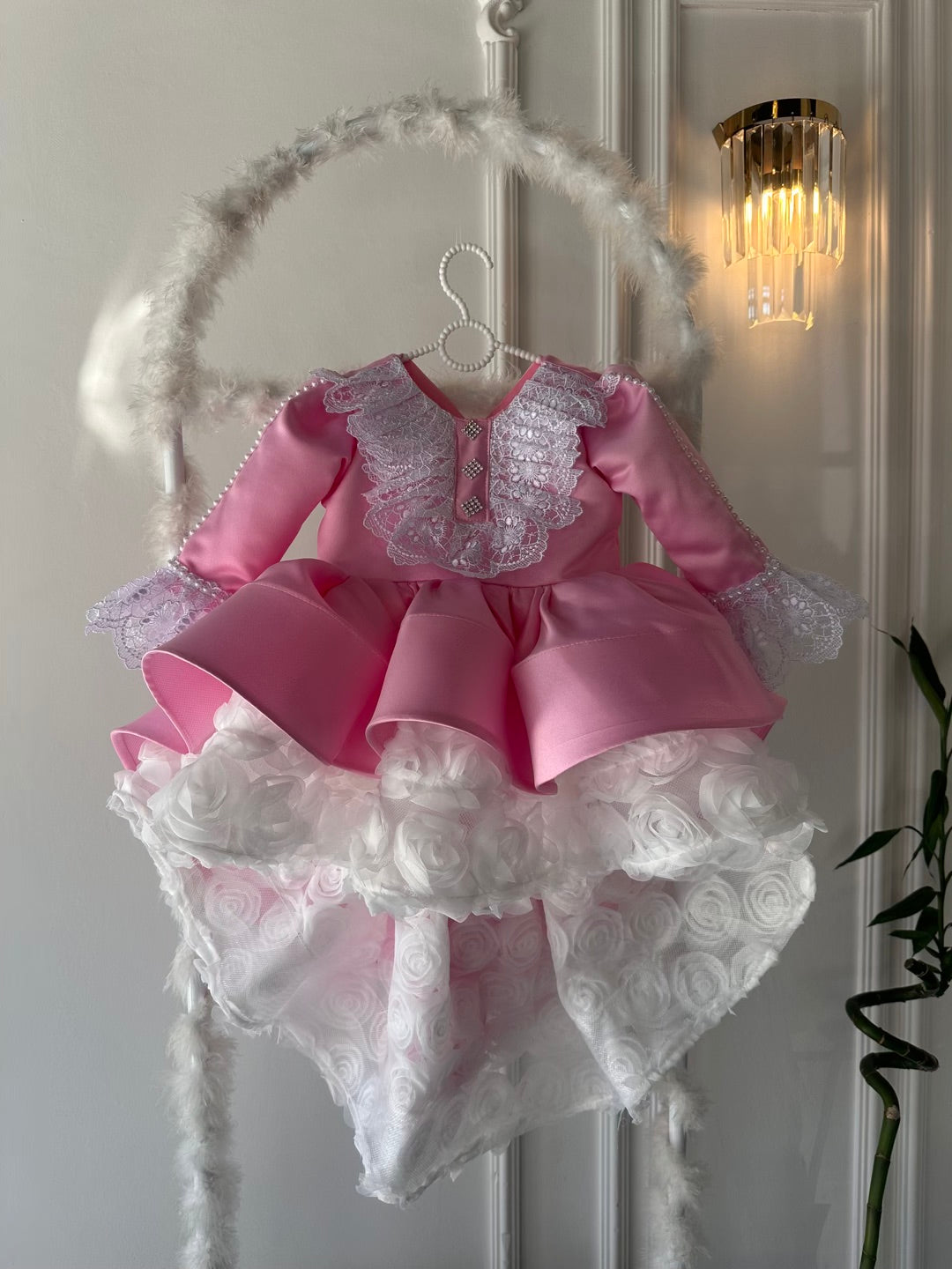 Kumaş Kuyruklu Dantel Güllü Bebek Abiyesi, özel günlerde minik prenseslerin zarafetini ortaya çıkaracak şık bir tasarıma sahiptir. Yumuşak tül kumaşı detaylı eteğiyle bebeğiniz rahat ederken aynı zamanda göz alıcı bir şıklık kazanır. Pembe-Beyaz rengi güllerle süslenmiş zarif tasarımı, doğum günü, düğün, nişan, bayram ve özel davetlerde bebeğinize masalsı bir görünüm kazandırır.
