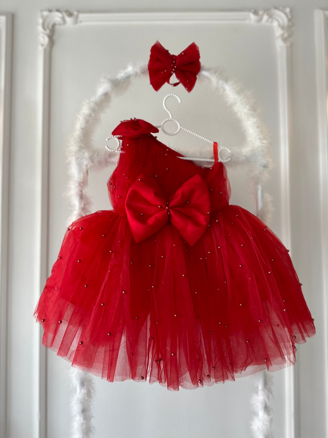 Prenses Tek Kol İncili Tül Detay Fırfır Etek Kırmız Bebek Abiyesi, özel günlerde minik prenseslerin zarafetini ortaya çıkaracak şık bir tasarıma sahiptir. Yumuşak tül kumaşı detaylı eteğiyle bebeğiniz rahat ederken aynı zamanda göz alıcı bir şıklık kazanır. Kırmızı rengi süslenmiş zarif tasarımı, doğum günü, düğün, nişan, bayram ve özel davetlerde bebeğinize masalsı bir görünüm kazandırır.