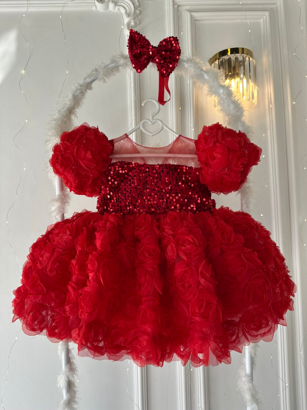Pul Payet Kırmızı Güllü Bebek Abiyesi, özel günlerde minik prenseslerin zarafetini ortaya çıkaracak şık bir tasarıma sahiptir. Yumuşak tül kumaşı detaylı eteğiyle bebeğiniz rahat ederken aynı zamanda göz alıcı bir şıklık kazanır. Kırmızı rengi güllerle süslenmiş zarif tasarımı, doğum günü, düğün, nişan, bayram ve özel davetlerde bebeğinize masalsı bir görünüm kazandırır.