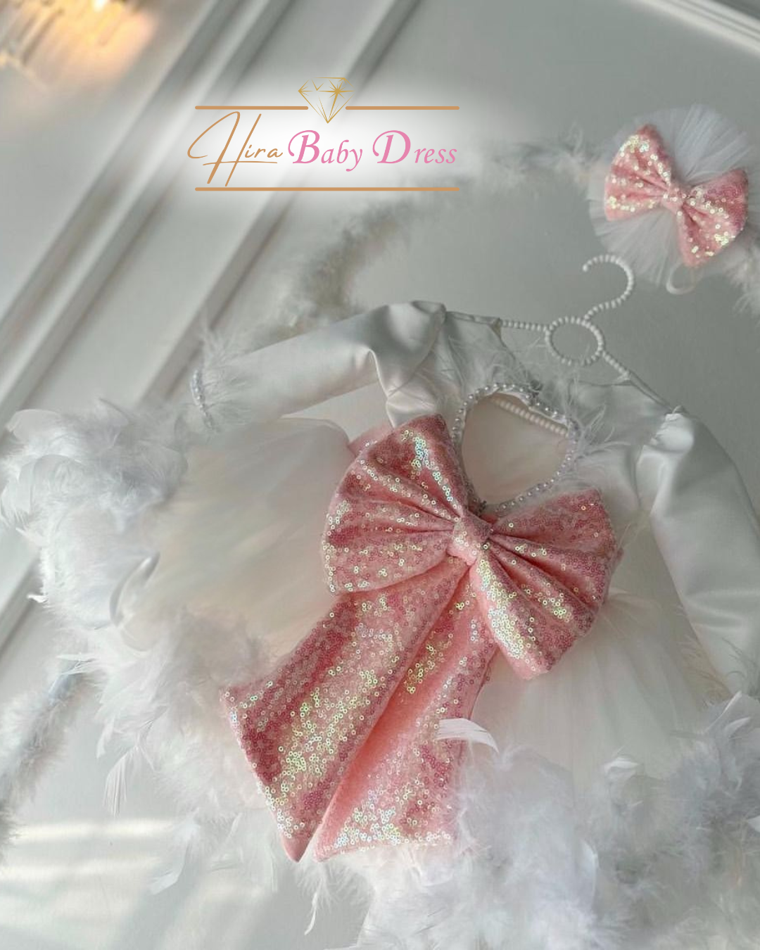 Minik prensesiniz için hayallerinizdeki kız bebek elbisesi işte karşınızda! Bu eşsiz tasarım bebek abiye, sırtındaki zarif tüylü dekolte detayı ile görenleri adeta büyülüyor.