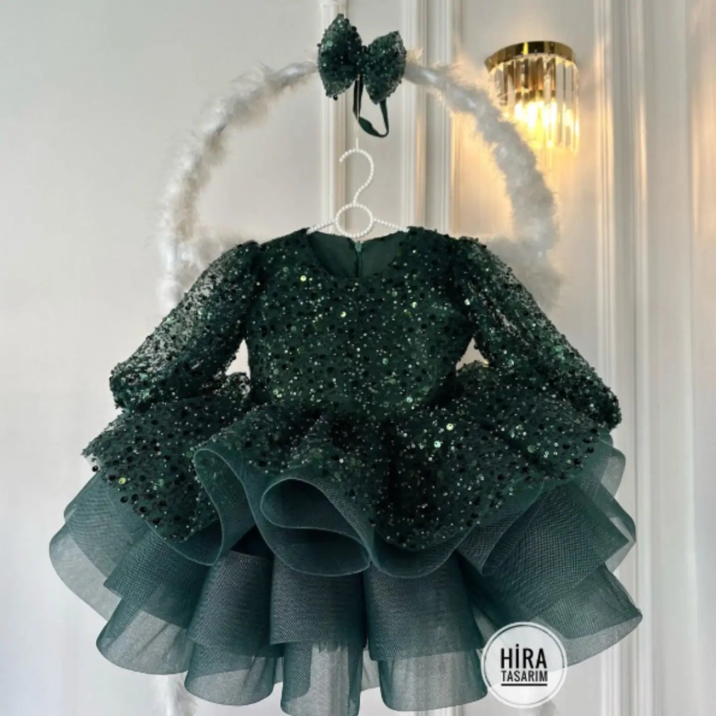 💚✨👗 "Yeşil Pullu Kurdele Tutu Bebek Düğün Kız Elbisesi" 👗✨💚